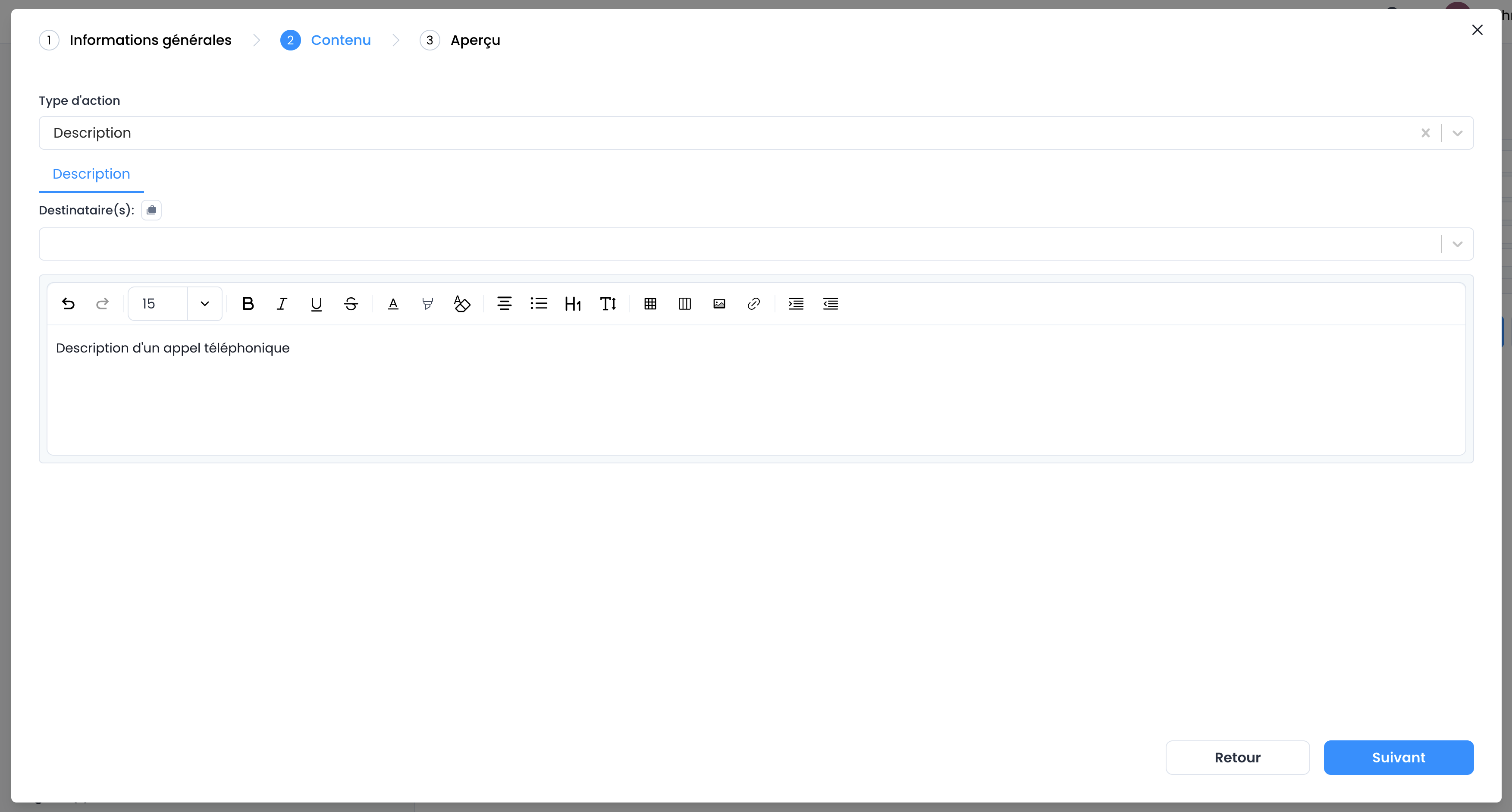 - Description détaillée : Un grand champ de texte vous permet de documenter l'événement (ex: le compte rendu d'un appel téléphonique, les conclusions d'une recherche, le détail d'une décision interne).
