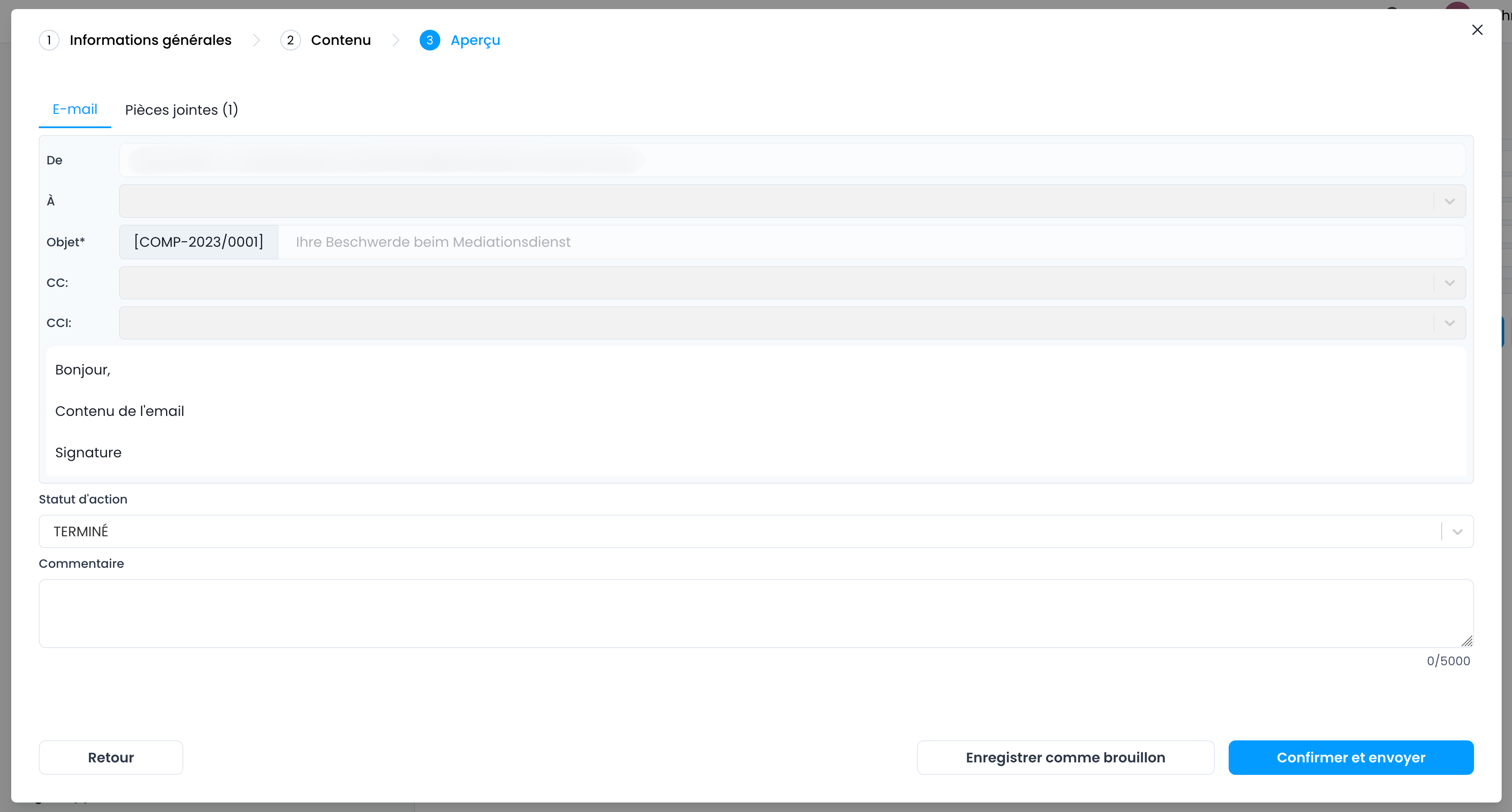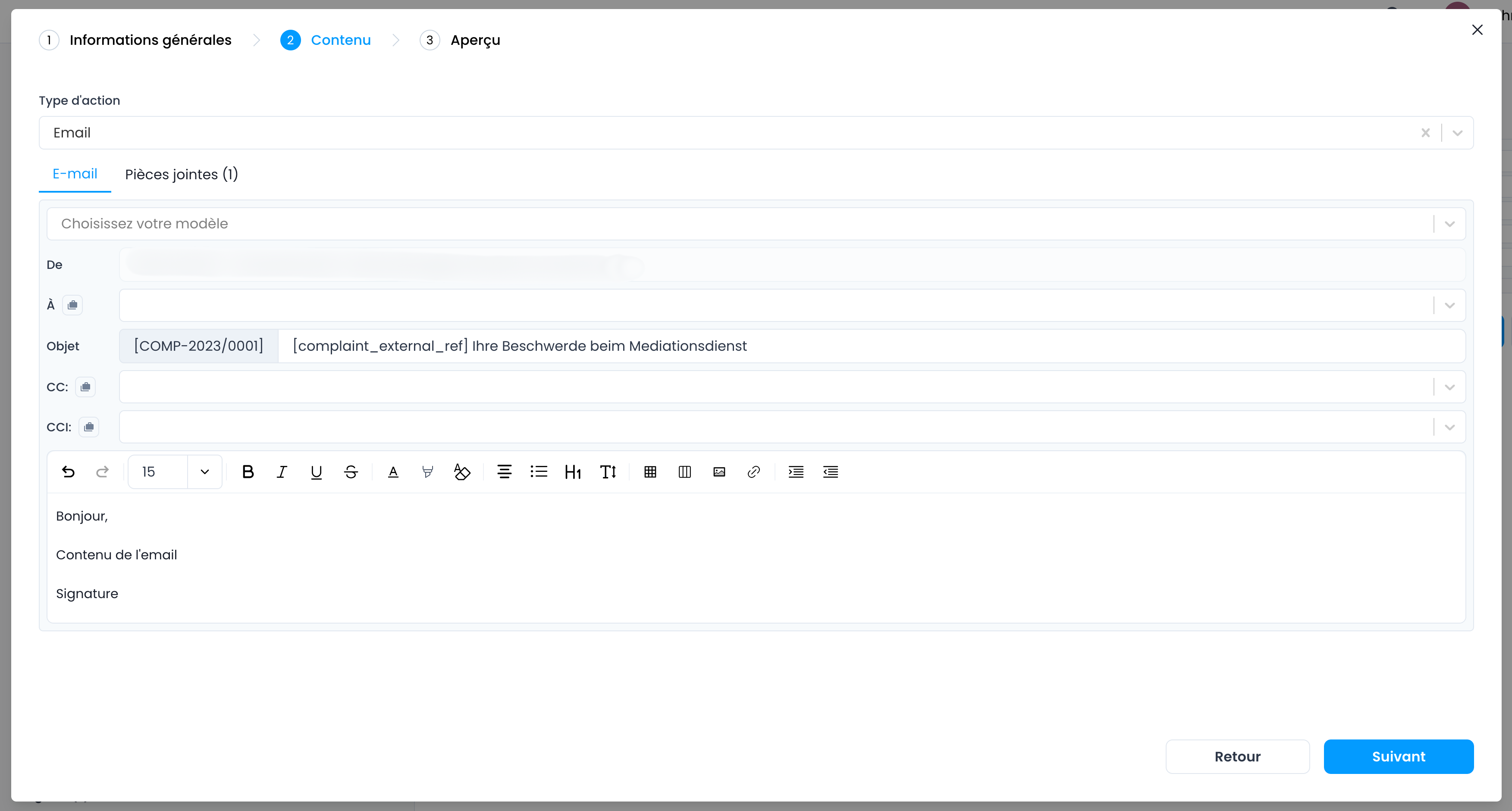 Envoyer accusé de réception). _ Champs d'envoi : _ Description: Définition des adressesDe,À,CC,CCI. _ Pré-remplissage : Les champs sont pré-remplis en fonction de l'action sélectionnée : _ Pour un email au plaignant : l'adresse du plaignant est ajoutée au champ À. _ Pour un email à l'entreprise : l'adresse de l'entreprise ou de son contact est ajoutée au champ À. _ Objet : _ Description : Le sujet de votre courriel. _ Pré-remplissage : Il est pré-rempli soit avec le sujet par défaut défini pour votre service, soit avec le sujet spécifié dans le modèle que vous avez sélectionné. _ Corps du message : _ Description : Rédigez le contenu via l'éditeur de texte riche. _ Pré-remplissage : Le contenu du modèle sélectionné est inséré. La signature d'email configurée au préalable dans votre profil apparaîtra automatiquement à la fin du corps du message.