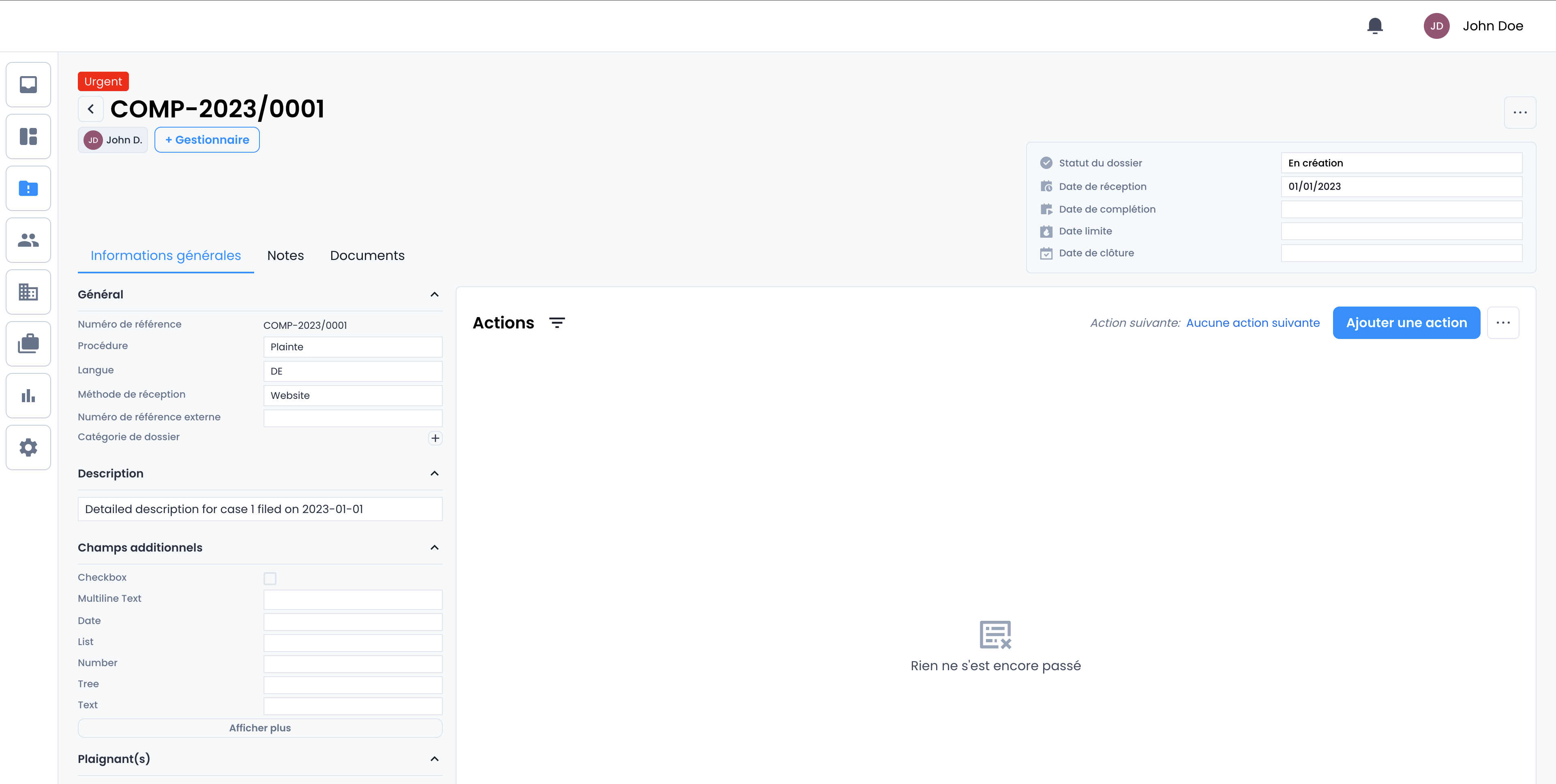 | Action | Définit l'action que vous effectuez au sein du dossier. (ex: Envoyez accusé de réception au plaignant, Demande d'informations supplémentaires, etc) |