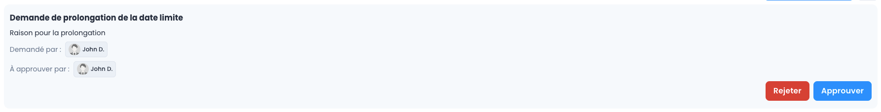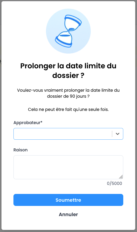 Lorsque le traitement d'un dossier excède la date butoir initialement fixée, CompMan offre un mécanisme structuré pour demander une prolongation de la date limite. Ce processus est soumis à une validation et est limité en nombre d'utilisations.