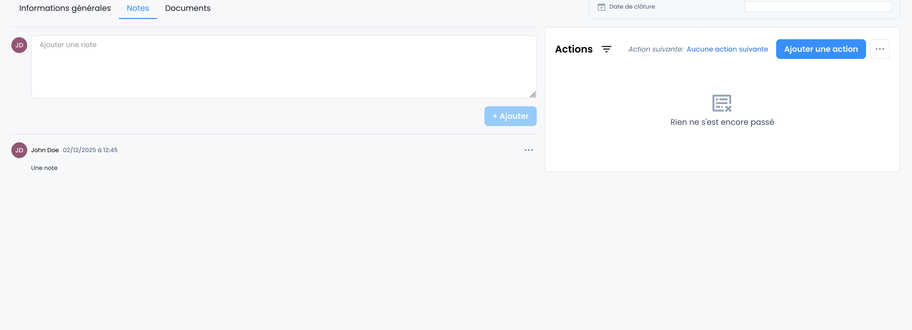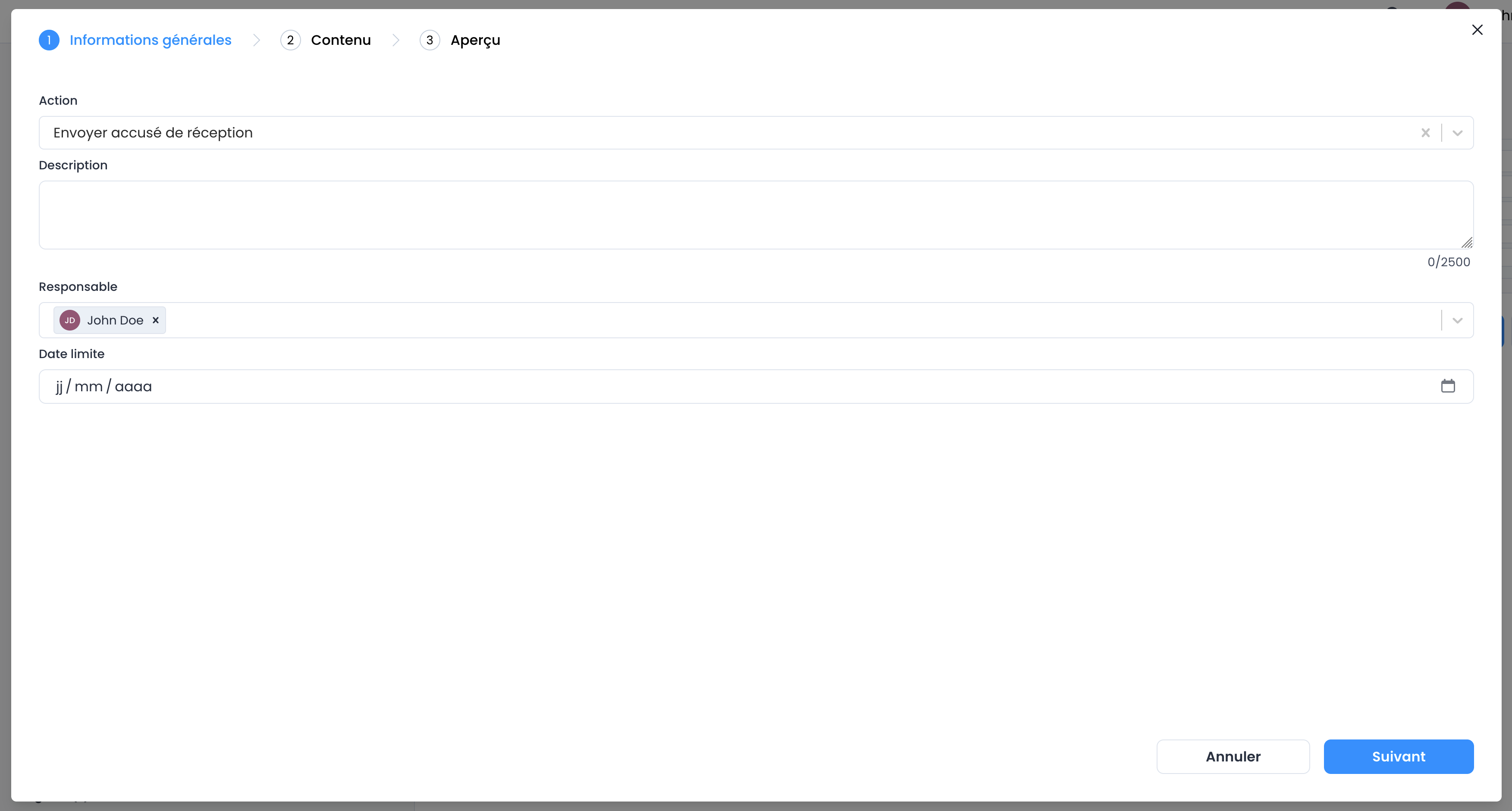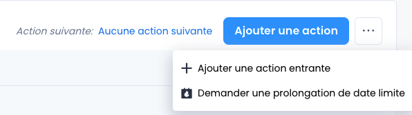 La création de tous les types d'actions se déroule en trois étapes distinctes. Pour initier le processus, cliquez sur le bouton "Ajouter une action" sur la page de détail du dossier.