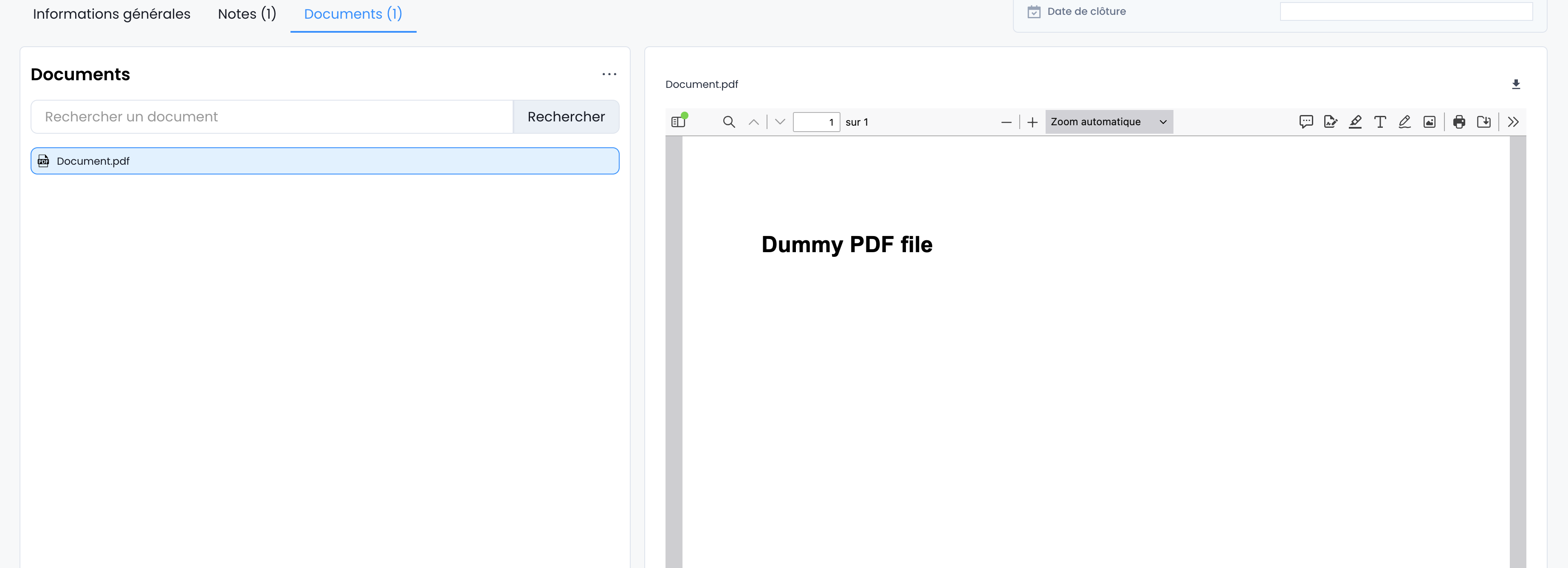 L'onglet Documents est la zone de stockage centralisée du dossier. Il répertorie toutes les pièces jointes et les documents importants qui ont été envoyés ou réceptionnés via les actions du dossier (emails, courriers, etc.).
