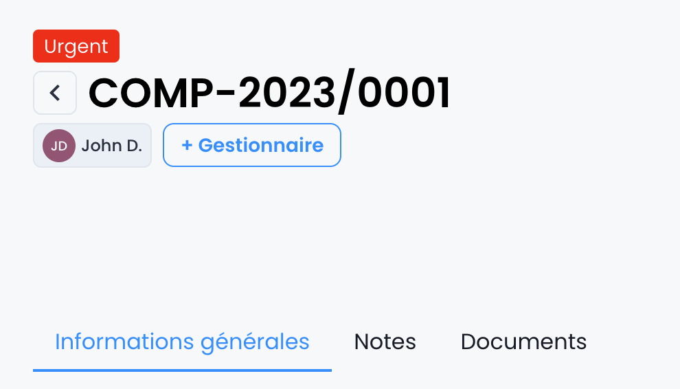 + Gestionnaire) permet d'assigner un gestionnaire au dossier. Cette partie reprend donc la liste des utilisateurs assignés au dossier. - Navigation : Vous pouvez naviguer entre les différentes pages d'un dossier, les informations générales, les notes ou encore les documents. Ces différentes parties sont détaillées plus bas.