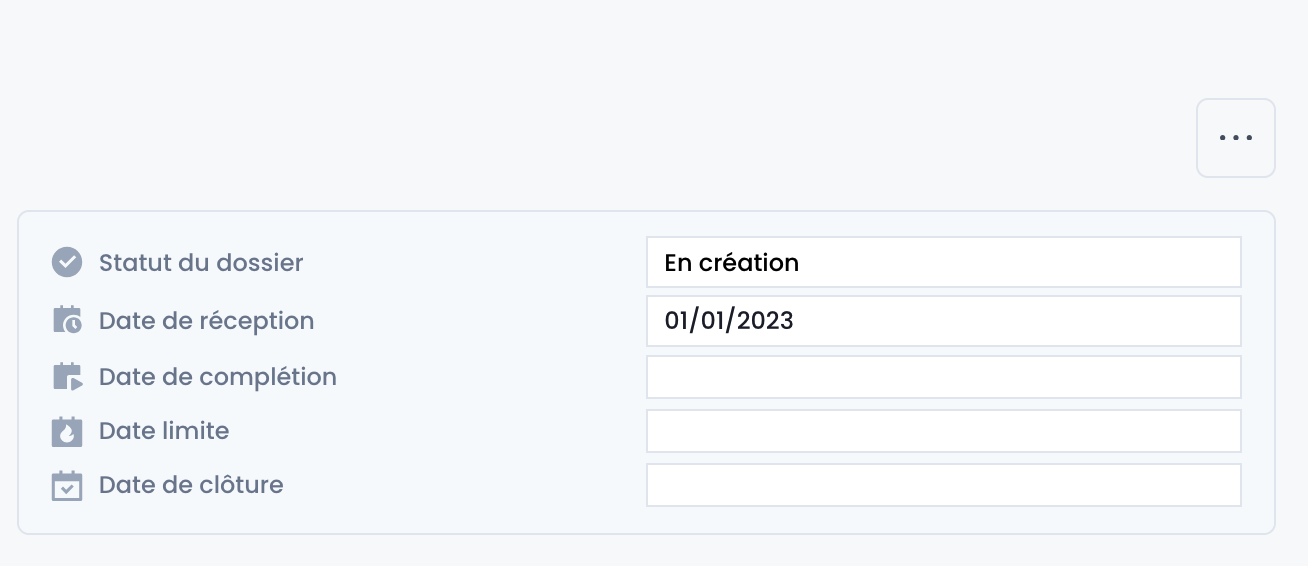 - Date de réception : La date à laquelle le dossier a été initialement reçu (ex: 20/01/2023).