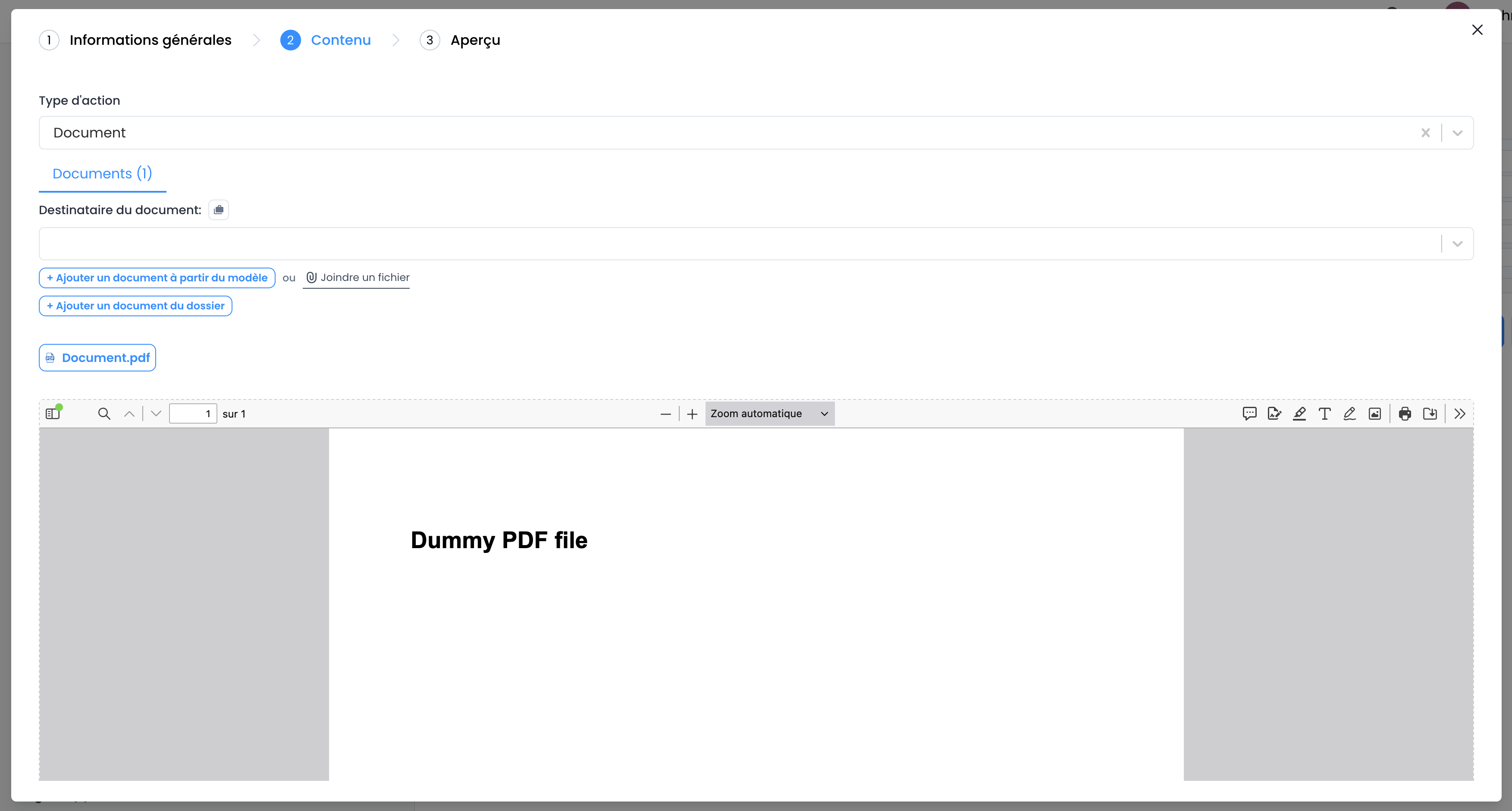 - Sélectionnez le modèle de contenu (template) que vous souhaitez utiliser. La plateforme générera un document au format PDF (ou autre) basé sur les données actuelles du dossier.