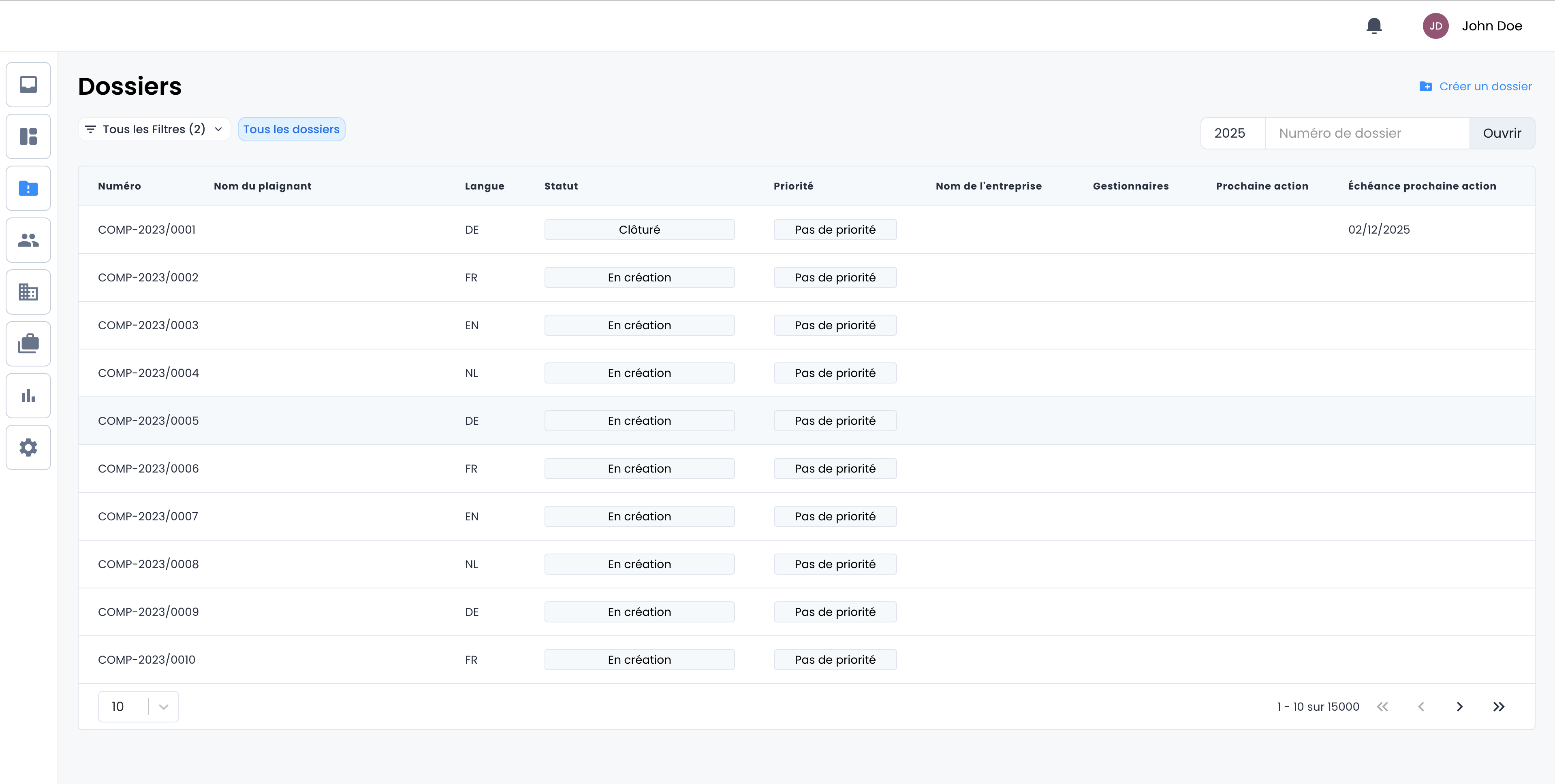 - Vue complète de tous les dossiers disponibles sur la plateforme.