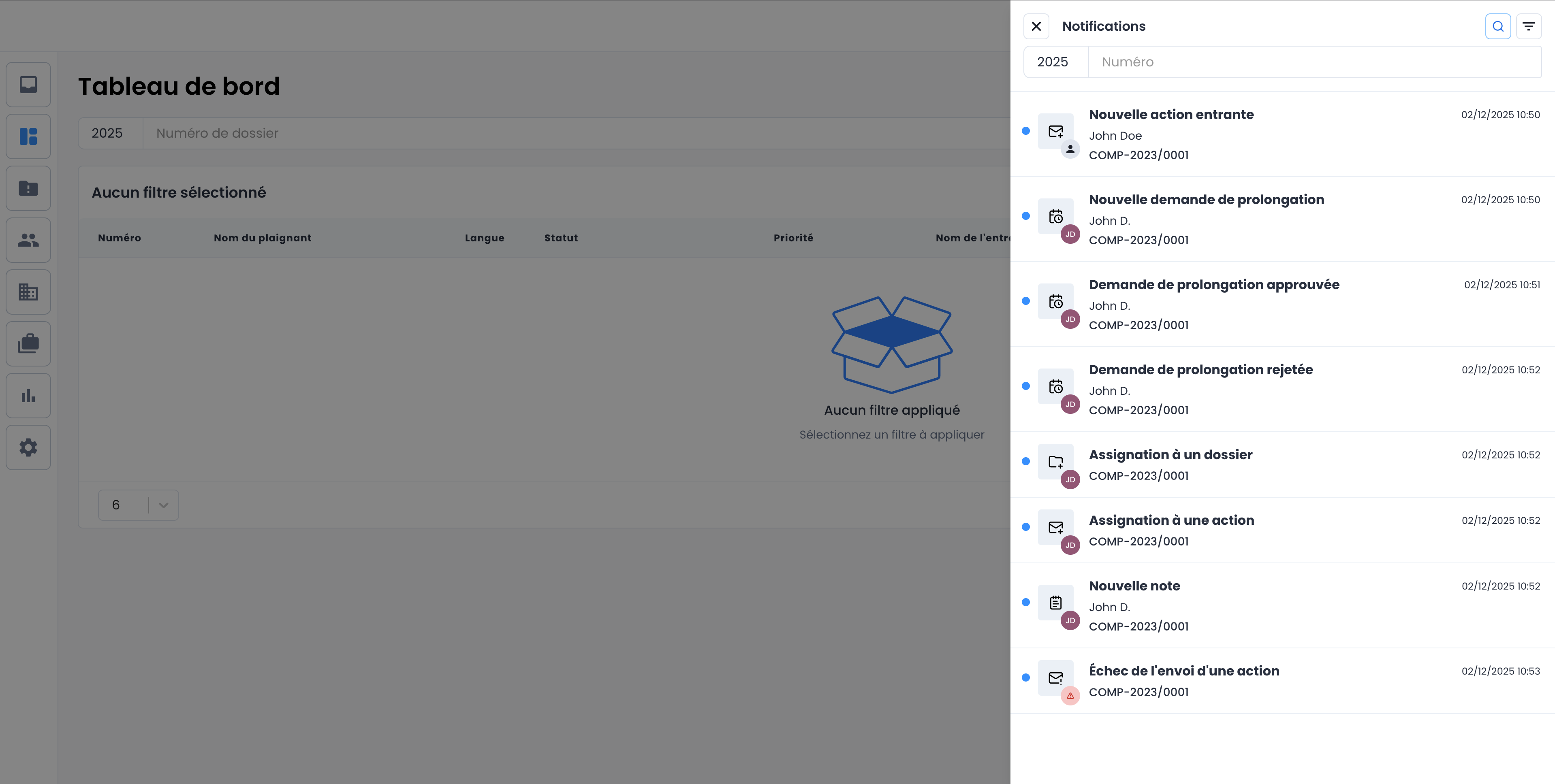 - Navigation : Chaque notification est cliquable et vous permet de vous rendre directement sur le dossier ou l'événement spécifique qu'elle signale. C'est donc un excellent moyen de naviguer entre les dossiers qui nécessitent votre intervention immédiate.