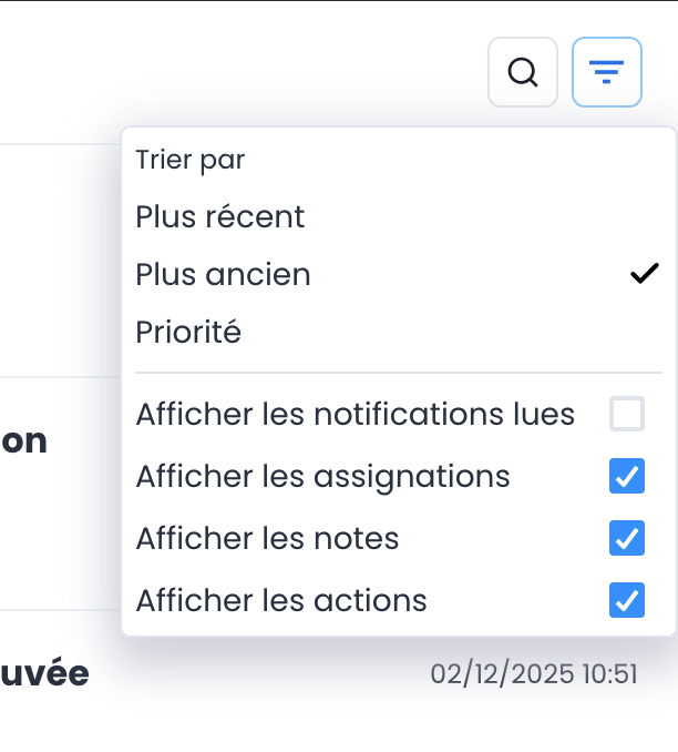 - Plus ancien : Affiche les notifications les plus anciennes en premier (tri croissant par date).