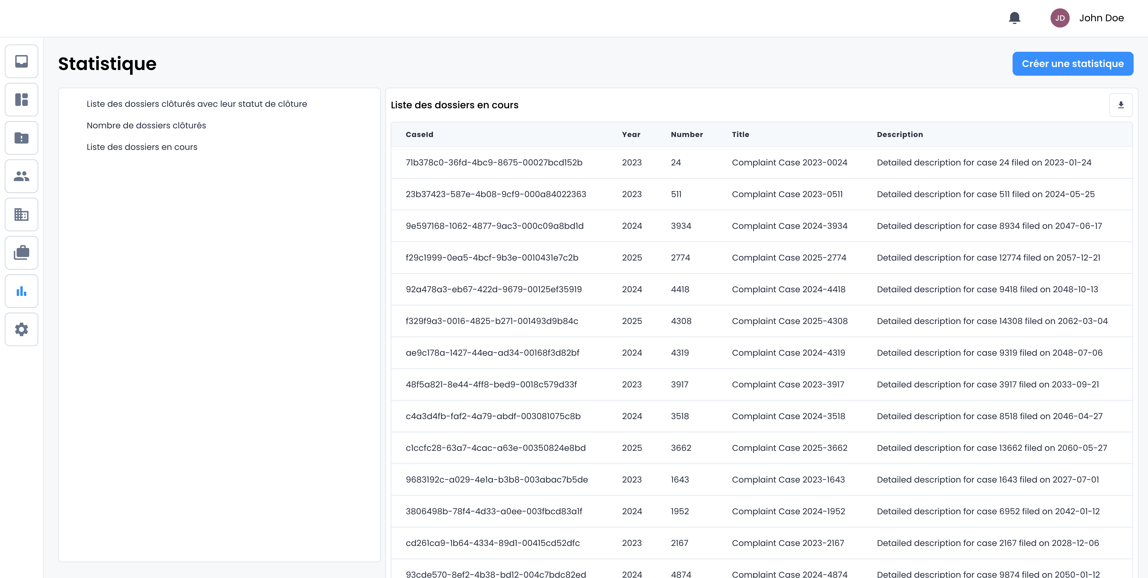 La page Statistiques (accessible via la barre latérale) est votre outil d'analyse et de reporting. Elle est conçue pour vous permettre d'extraire rapidement des données structurées et consolidées de l'ensemble des dossiers de la plateforme.