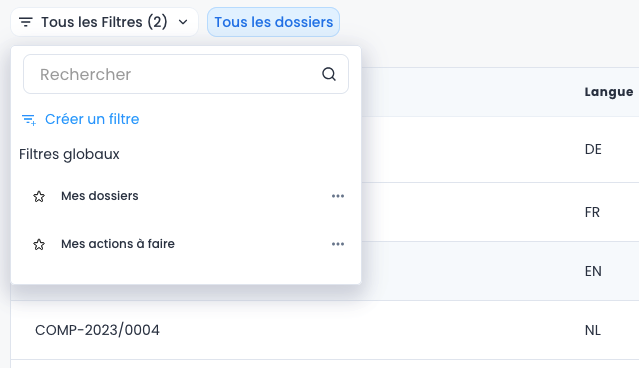 Les Filtres sont des outils de recherche puissants qui vous permettent de trier et de cibler uniquement les dossiers qui vous intéressent à un moment donné. Ils vous aident à transformer une longue liste de dossiers en une sélection précise et gérable.