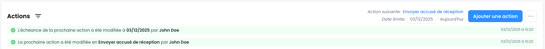 - Historique et Traçabilité : Tout changement (changement de statut, nouvelle date limite) effectué par le workflow est automatiquement enregistré dans la chronologie d'Actions du dossier, assurant une traçabilité complète.