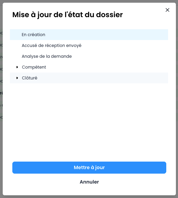 - Cliquez sur le statut actuel du dossier, une popup s'ouvrira